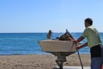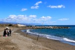 We found our small hotel, single story, set behind walls, with an inner courtyard and pool, in a residential neighbourhood. It was also a ten-minute walk from the sea. We walked along the sea, in sunshine, watching children playing on the stony beach, and men fishing. Further along was a seaside restaurant, a man behind grilling sardines in the old-fashioned way with an open fire.