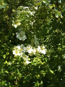 This wonderful clematis blooms first every year. It grows in a south-facing garden, weaving its way through a euonymus elata.